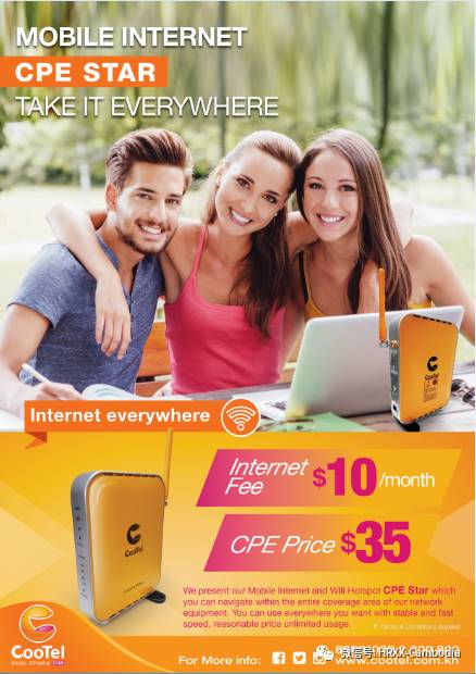 COOTEL公司CPE,外观时尚、方便快捷无需安装,服务费每月只需10美元,不限流量,是家庭及中小商户互联网接入的优先选择,还等什么,赶快去COOTEL营业厅购买吧。详询:8888/0383300800