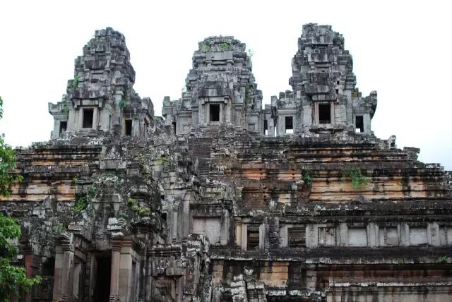 吴哥寺的建筑主体分为三层平台。在第三层平台矗立着5座宝塔,通往主塔的台阶被称为“天堂阶梯”,几乎与地面垂直,攀登时需手脚并用。