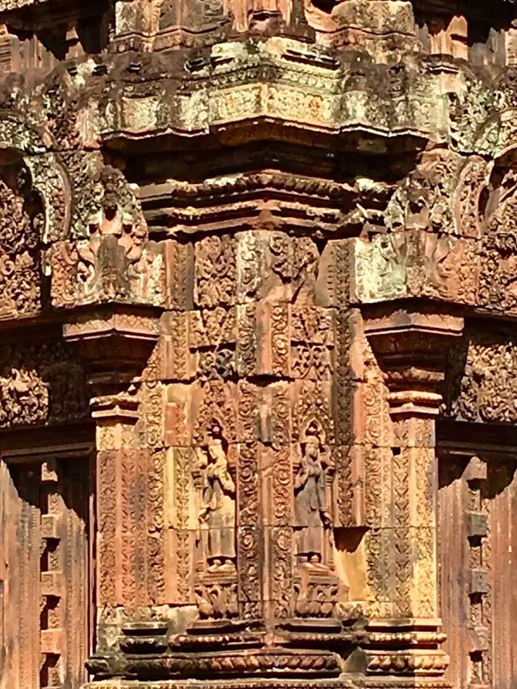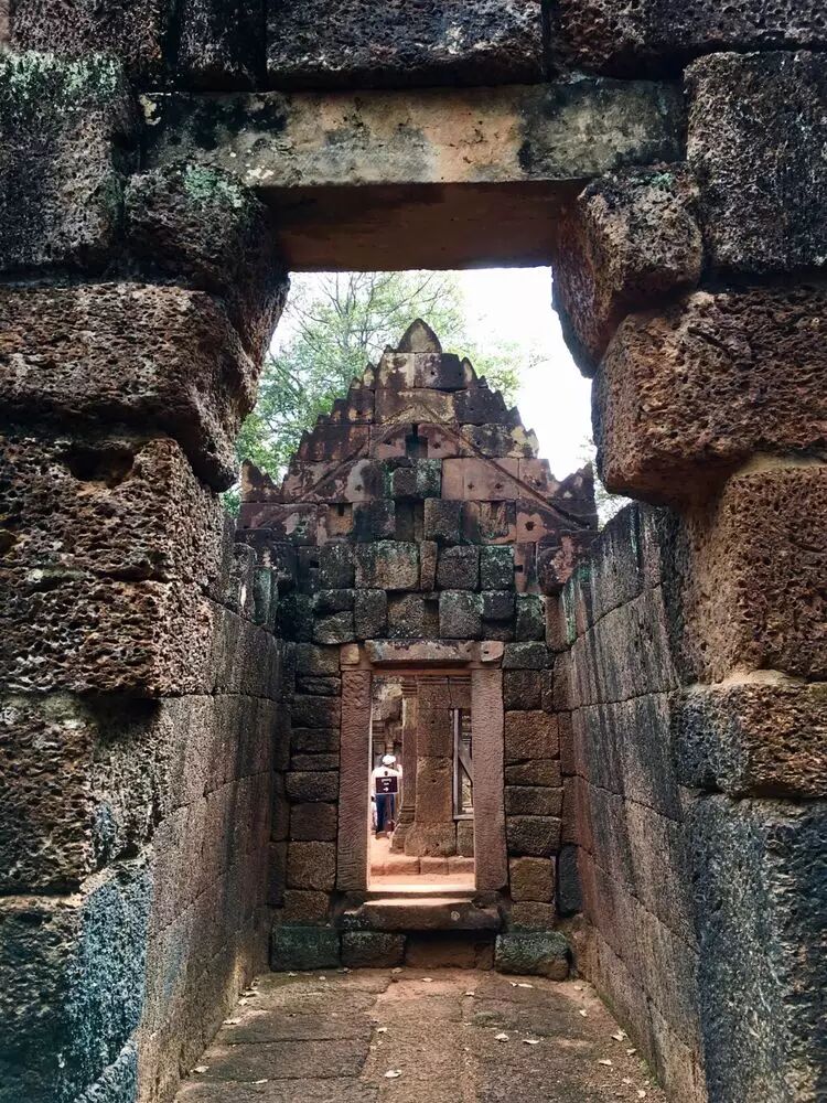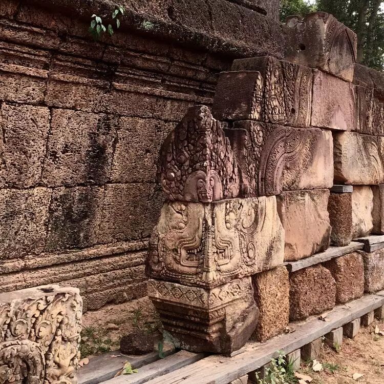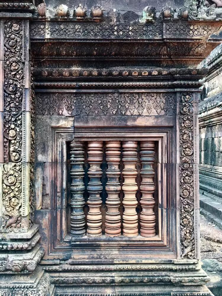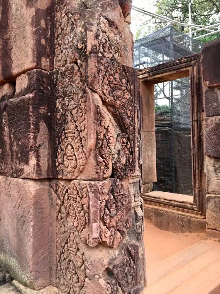 建造女王宫使用的是红砂岩,而吴哥遗迹中大多数寺庙使用的是青砂岩。红砂岩色彩艳丽,也可以像木头一样雕刻细腻繁复的图案。