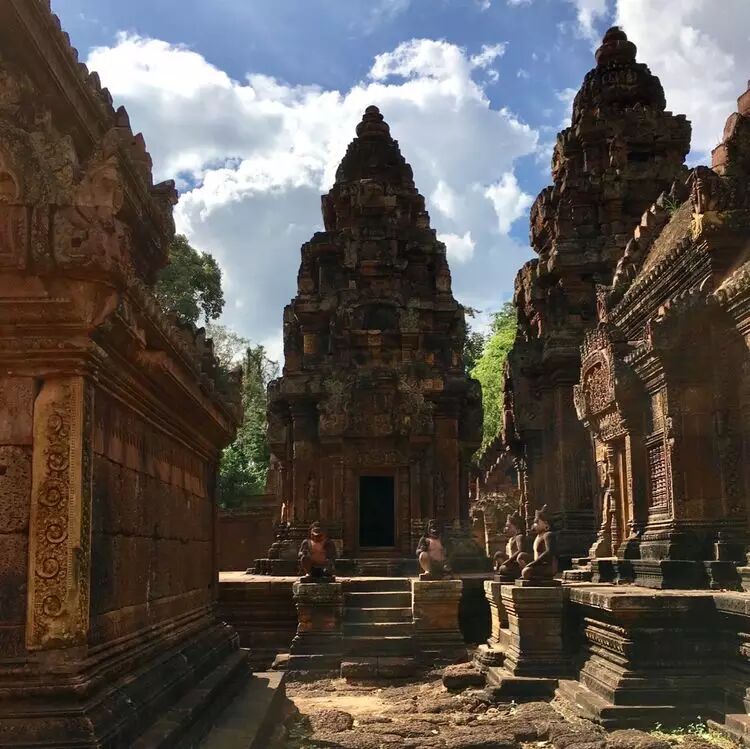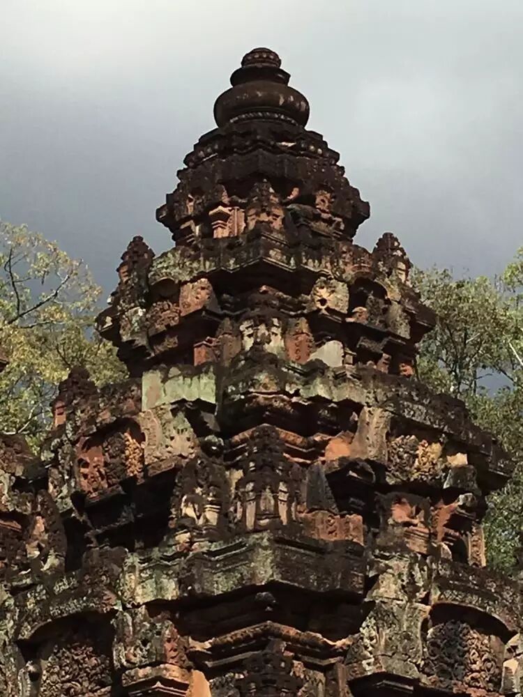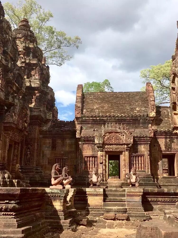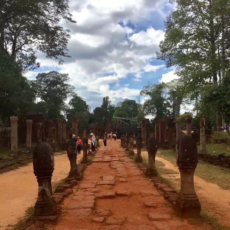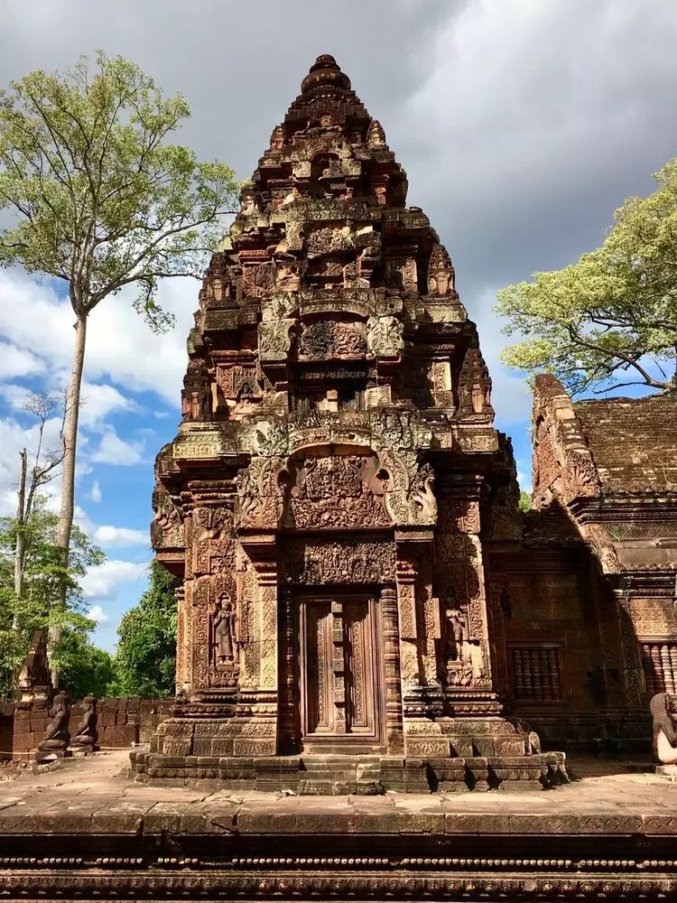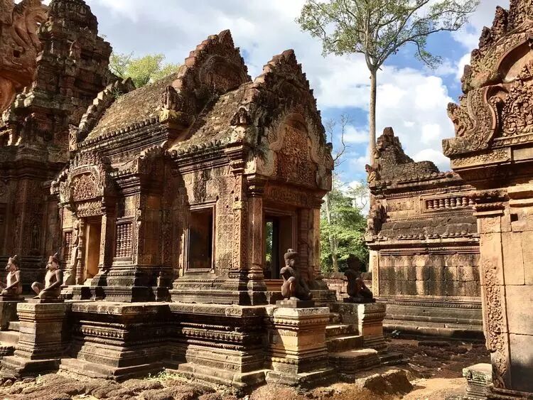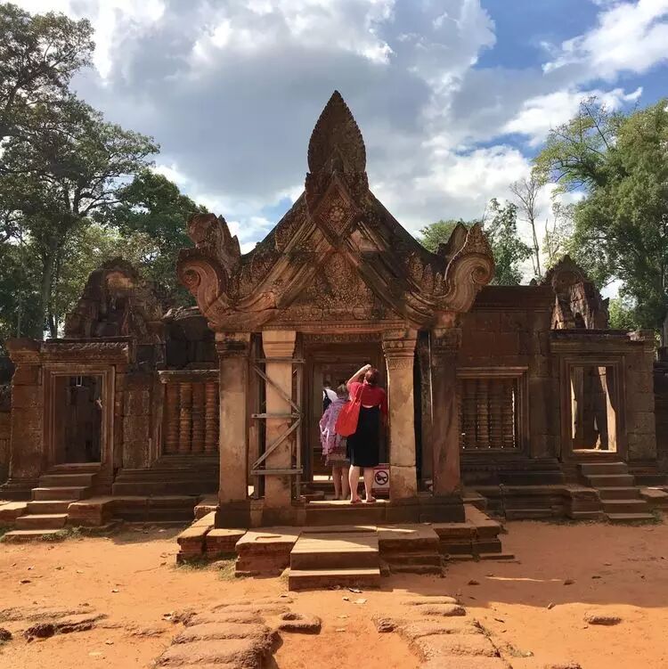 在吴哥遗址群中女王宫是女权的象征,神殿小巧玲珑,整体外观呈现棕红色。面积仅有500平方米,但却是一座有特色有故事的寺庙。
