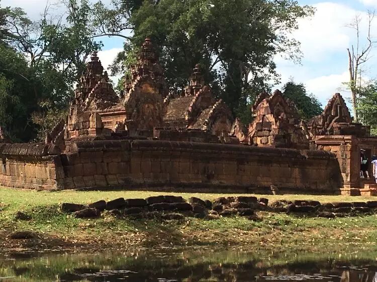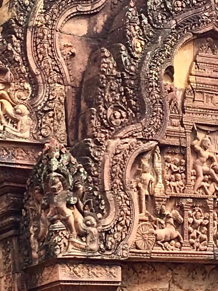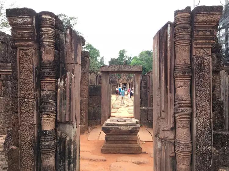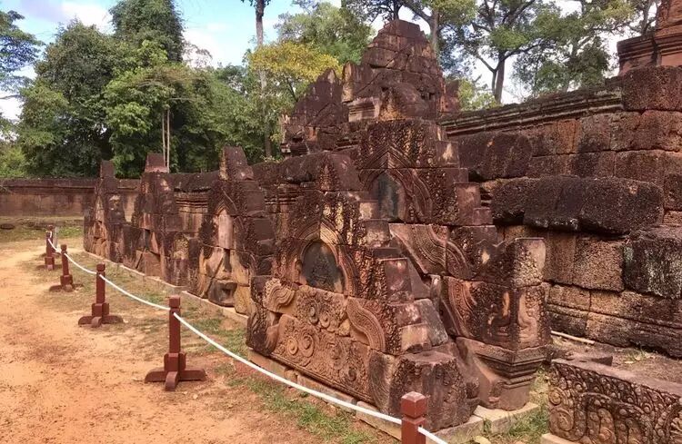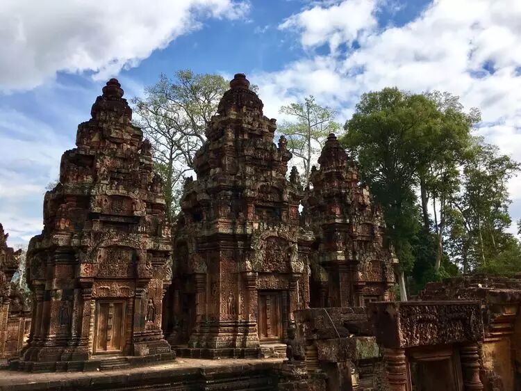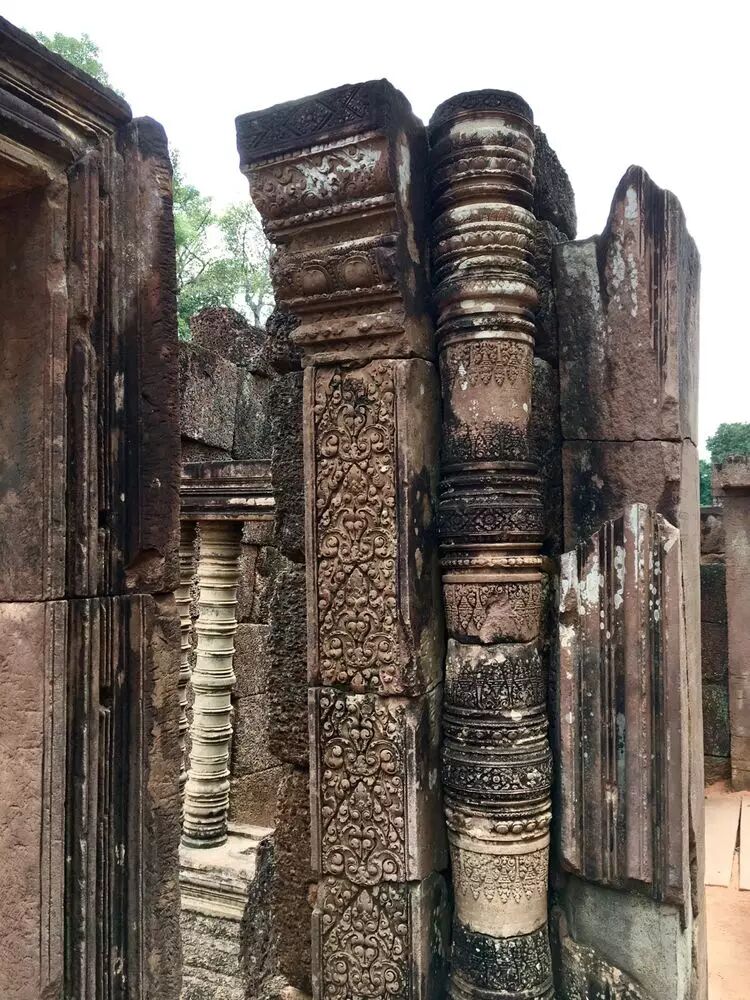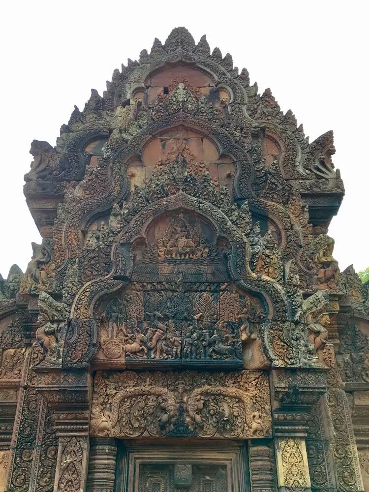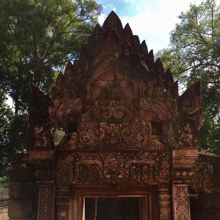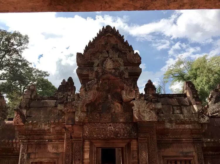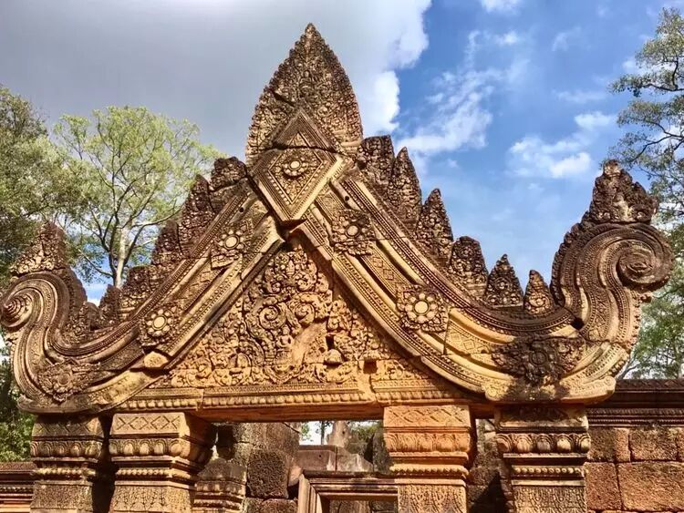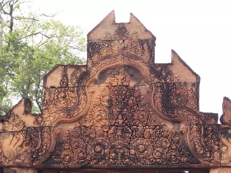 女王宫的雕饰刀法细腻流畅,造型繁复圆润,线条纤细柔美,是吴哥遗迹所有石雕作品的上乘之作,也是柬埔寨艺术的巅峰之作,享有"吴哥艺术之钻"的美誉。