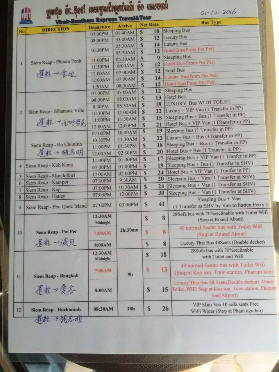 更全面的可以参考当地汽车站:http://www.virakbuntham.com/schedules 另外还有嘟嘟车、摩托车,在 金边还有公交车和人力三轮车。