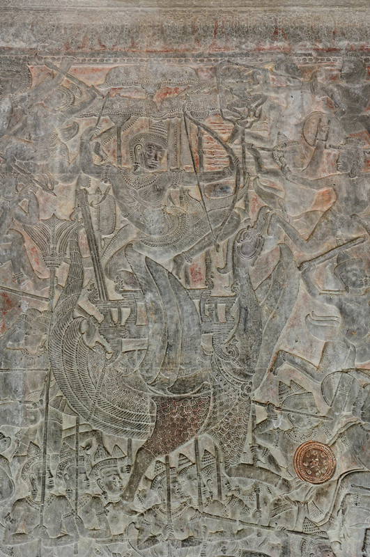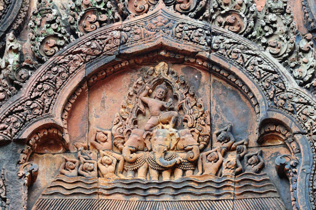 湿婆 Siva 印度教的破坏神,同时也是转化再生之神,坐骑白公牛南迪,配偶雪山女神前额中间有着第三只眼睛。吴哥寺第一层回廊、女王宫、都能看到湿婆的浮雕。 [因陀罗在渡海]