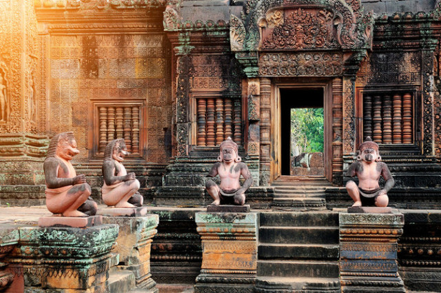 哈努曼 Hanuman 印度史诗《罗摩衍那》的神猴,拥有四张脸八只手。罗摩是大神毗湿奴的化身,罗摩之妻悉多非常美丽,被楞伽城10头魔王罗波那用计劫走。猴王派手下大将哈努曼随罗摩去寻妻。哈努曼勇敢机敏,能腾云驾雾,帮罗摩征服强敌,救出悉多。在吴哥寺第一层回廊和女王宫可以看到哈努曼形象。Hanuman后来也被记为是西游记孙悟空的原型。
