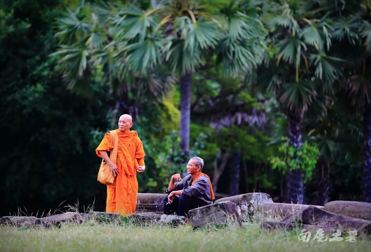 吴哥窟周围的绿茵草地上,经常有僧人们在散步、看书,他们目光坚定,面带微笑,这是佛教国家给予的宽容与尊重带来的。神庙沧桑的色调前,僧人鲜黄的僧袍相映,从古到今,静中有动,看他们走过来的坚定脚步,沉寂几百年的吴哥窟是活的。
