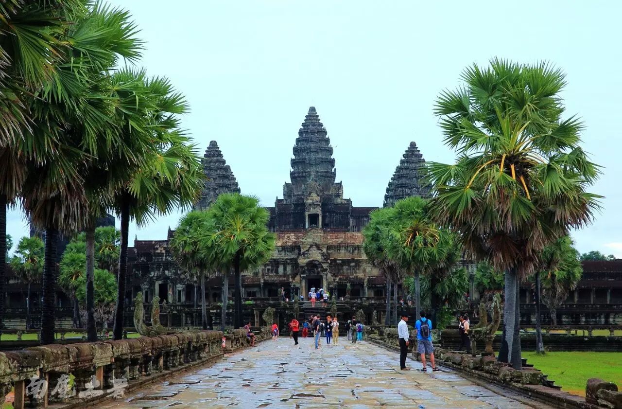 吴哥窟有一条长方形的护城河,围绕一个长方形的苍翠绿洲,绿洲有一道寺庙围墙环绕,正中的建筑是吴哥窟的须弥山金字坛。