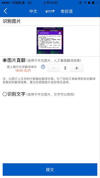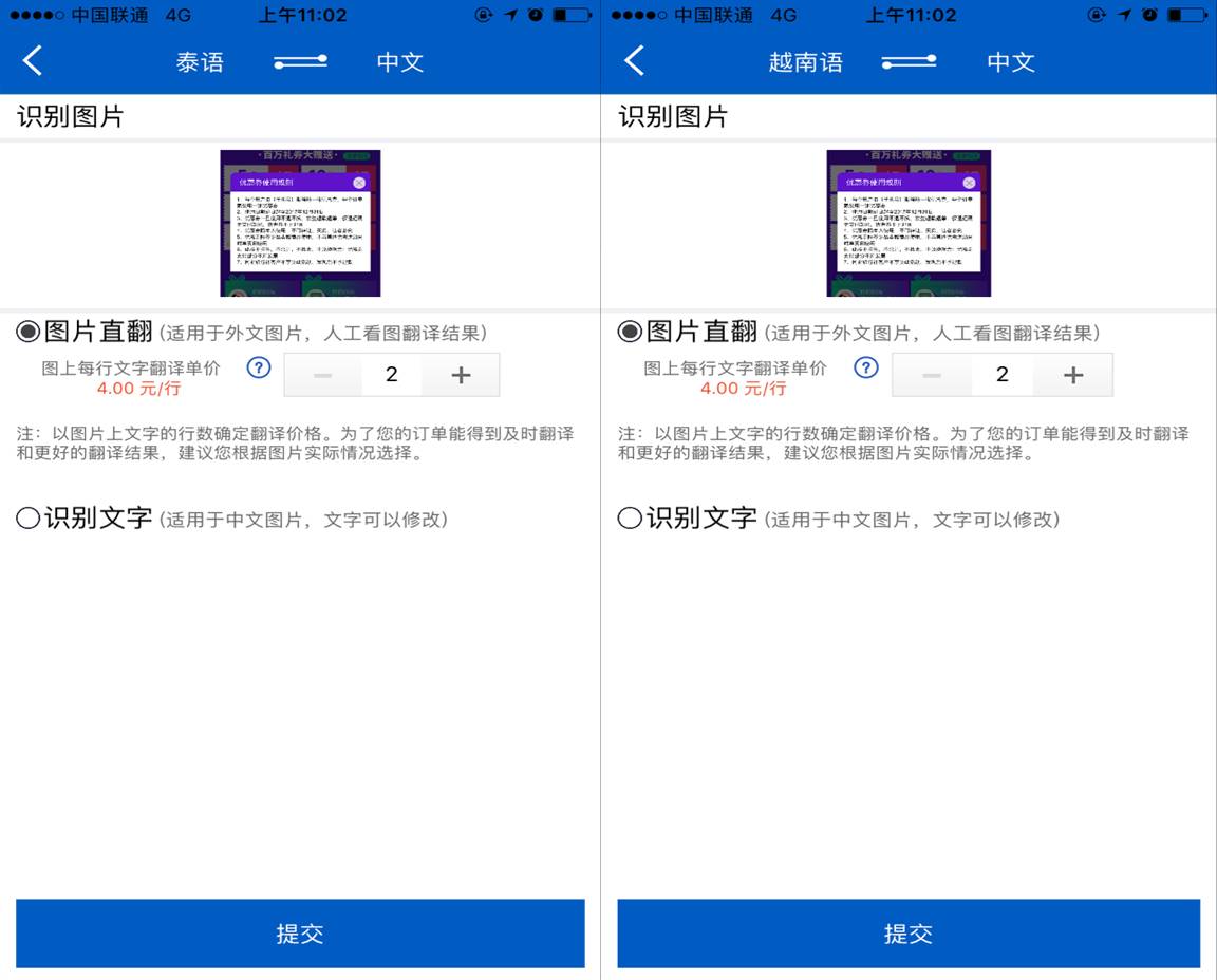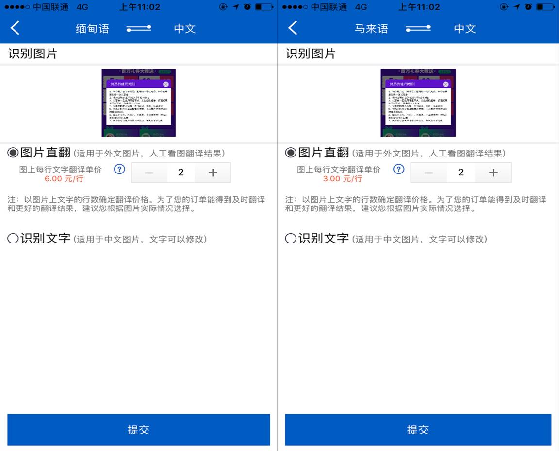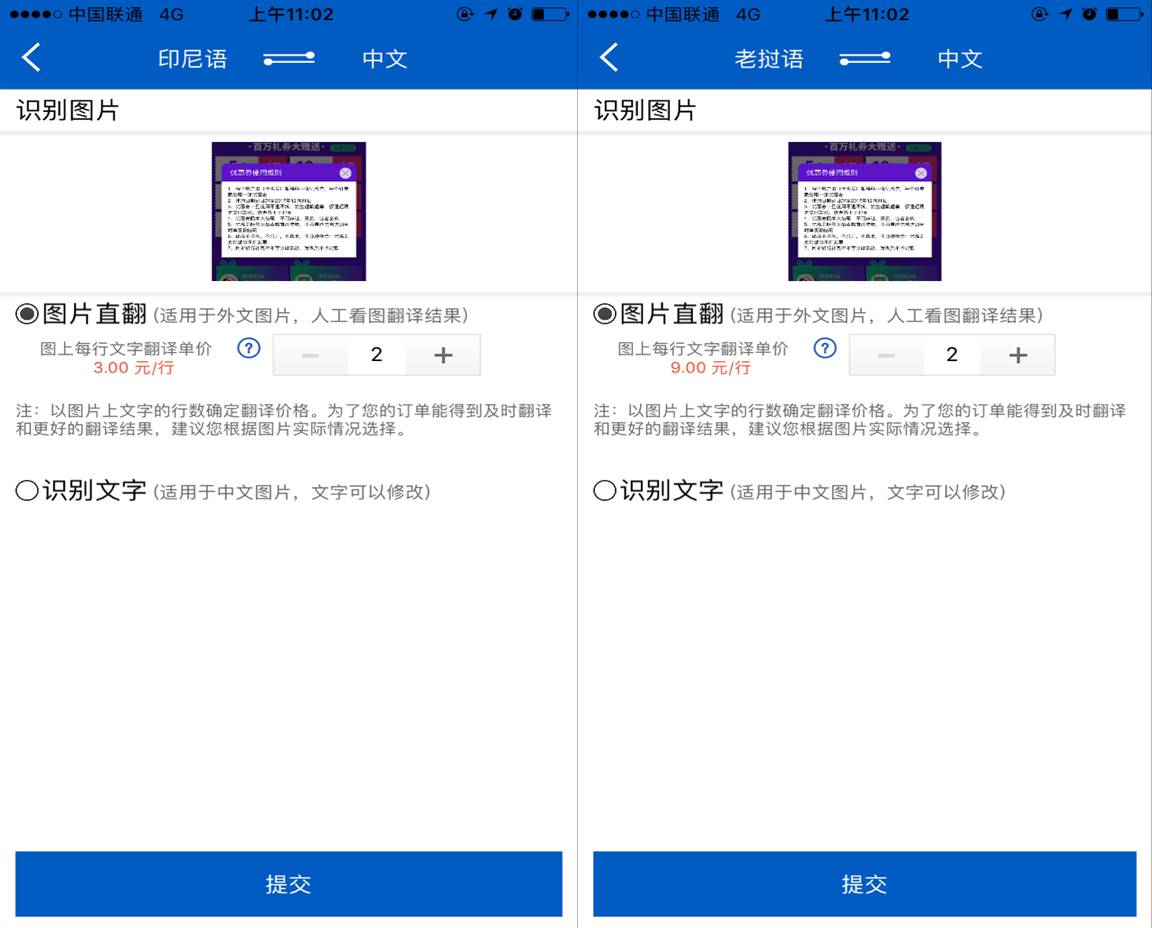 2 What is 图片翻译增加图片直翻功能? 选择图片翻译直接进行拍照,对于外文翻译可以直接按照行数进行翻译,每个语种翻译的价格略有所差异,参考以下截图~