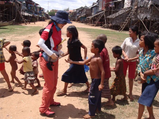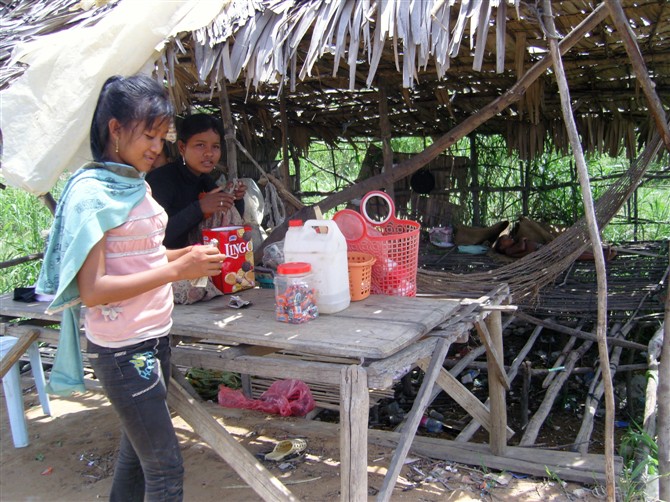 在这里第一次接触到柬埔寨的小孩,小孩子们都很可爱,但周围的环境让他们早熟,一到浮村,两个漂亮的小女孩就围了上来,标准的英语对我们说,你们好,你们哪里来的呀?你叫什么名字啊?(一听就是书本上的,我真想对她说,how are you, fine, thank you, and you....).巴拉巴拉很多以后,就说,请你们买我们的本子吧,我们没有钱上学。。。结果6个本子,真的很薄很薄的本子,居然要我们6刀……因为在网上看到说,给孩子钱,最后孩子肯定给大人的,于是小童拿出了杀手锏,在国内买的阿尔卑斯(不是广告,不是广告),说,给你们糖吃吧!然后……呼啦一声,从东南西北东西南北8个方向迅速窜出一群一群的柬埔寨小孩子,全部伸手向我们要糖,看着他们脏兮兮的小脸和小手,谁能忍心不给呢,结果真是小朋友们如滔滔江水连绵不绝……直到我把包都翻出来给他们看,说,没了,真没了,他们才罢手,扭过头去,童童也是超有大腕之风度,被一群粉丝围住,似乎要签名一样。