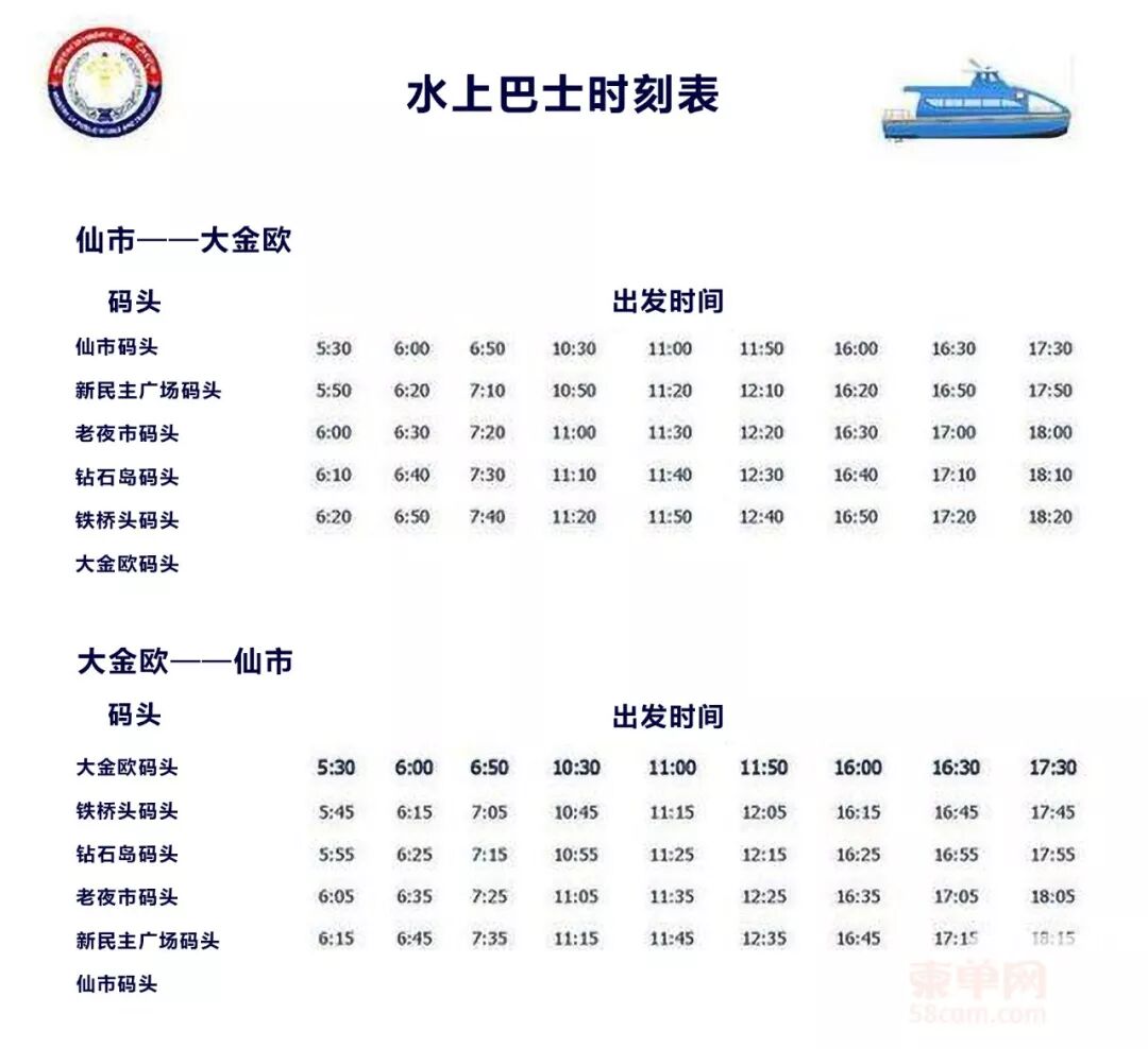 现在我们就一起了解一下航运信息。水路公交的起始站分别是仙市码头和大金欧码头。中间停靠的港口分别是:新民主广场码头、老夜市码头、钻石岛码头、铁桥头码头。水上公交的运营时间为早上5点30分到下午6点。航线全长25公里,水路公交走一趟需要34分钟。