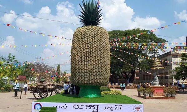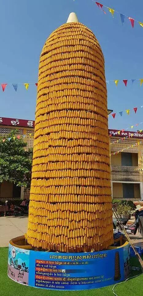 以“产粮我最劲”的名义,马德望的2018新年限时限地点展品是——超级无敌大菠萝/ម្នាស់យក្ស(五千个新鲜菠萝堆出来的,高达5米)、超级无敌大玉米/ពោតយក្ស(一万根新鲜玉米堆出来的,高达5米)