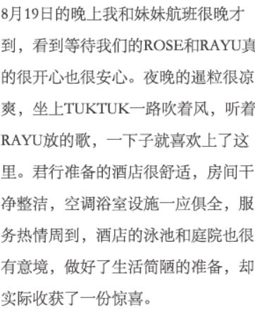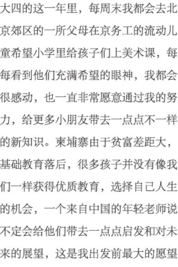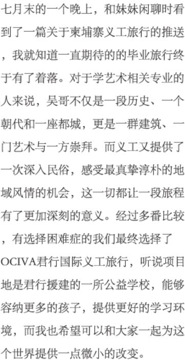一次说走就走的旅行是怎样诞生的?可能只源于看了一篇公众号的推送以后的好心情。 01 关于义工 第二天早上,我们来到了SHAC(Smiling Hearts Association for Children),见到了雷厉风行的校长,经过了简短的教学会议,学习了教师守则后,Teacher Yvonne就正式上线啦。 △ 出发前准备的教学内容,事实证明这是远远不够的 出发前,根据君行的建议,我们准备了两首英文歌、一份英文日常会话的教学提纲,打印好带过去,后来事实证明这个准备真的太明智了!当地小朋友的英语水平比我想象中要高一些,而且柬埔寨没有像国内一样相对固定的入学年龄,一年级从7岁到13岁都有,要找到大家共同感兴趣的学习内容真的很困难,每天我们都在绞尽脑汁想第二天的教学计划。 △ 我们都叫她柬埔寨小女神,漂亮可爱而且超级乖巧 所以以后有打算去的小伙伴们,提前可以多多准备一些英文歌(相比于童谣,他们对于Shape of you,Count on me,Big big world这类的流行英文歌更加喜欢)、话题(类似讨论家庭、梦想之类的)和能用英文表达清楚的游戏(谁是卧底、你画我猜和萝卜蹲之类的,萝卜蹲是他们的最爱~),都是充实课堂非常好的方法。 △给三年级小朋友准备的话题之一:星座,对于他们来说是全新的话题 △结束你画我猜游戏后的黑板,真的很可爱吖 歌曲的话,可以很快的拉近我们与孩子们之间的距离,他们都会配合的一起唱,他们会唱很多歌哦,每次大合唱的时候都超感动的。话题可以引导他们进行完整的英文表达,小朋友们词汇储备基本和国内相当,但是语法薄弱,词不成句,需要我们引导他们组织语言表达自己。游戏可以活跃课堂的气氛,也可以丰富他们的词汇,给他们介绍一个更大的世界。 △厨艺课程的环境和收到的证书,超有仪式感 义工教学之余参加的厨艺课程的体验也超级有趣,主厨老师非常可爱温和,大家在辛苦了一天之后聚在一起做好吃的,一起努力的告诉他吃不惯柠檬草NO lemongrass,真的很幸运遇到可爱的你们。 最后一天下午,大家一起去了吴哥国家博物馆。去吴哥窟之前来博物馆真的超赞,可以提前了解和学习,后面的欣赏也更加透彻,非常喜欢。 五天的时间真的过得飞快。又累又热的我们开始总是期盼下课的铃声,和小朋友们放学时全班起立一起唱的那一句的“Thank you teacher,see you tomorrow”。但是当最后一课的铃声响起,小朋友们的送别歌声变成了“Goodbye teacher,see you again”时,心里真的真的非常的舍不得,眼泪在眼眶里打转转。每一个真诚可爱的小朋友们好像天使一样,回过头来想一想,快乐的收获可以让疲累烟消云散。记不住他们很长很复杂的名字,我们给每个人私下里起了昵称:小女神、胖胖、小卷毛儿、学霸、小不点,还有没头脑和不高兴……我会永远记得他们,记得他们每天早上双手合十问好的样子,记得他们课堂上的大笑着积极举手的样子,保留好他们送给我各种小礼物,还有最珍惜的,临别的拥抱。 △志愿者证书与小朋友们的临别礼物 最后,感谢在这五天里作为我们坚实后盾的Rose、Rayu、tuktuk车司机还有辛苦的大家,每天都有tuktuk车准时接送我们往返学校,回到酒店就有刚出锅的饭菜,真的很温暖。虽然有几次因为香料和做法不是很习惯,但是餐厅经理及时发现了并且仔细询问我们的建议,给我们调整了菜谱,非常的感动也很感谢。有了他们的帮助和关心,省去了我们许多麻烦,让我们能够更能全身心的投入和孩子们的这一段美好时光。 △义工期间的自助早餐,每天都要认真吃早餐然后开启元气满满的一天呀 △高棉厨房的春卷、炸鱼、咖喱、Amok fish、Beaf Loc Lac、炒空心菜和百香果汁。强烈推荐大家在柬埔寨一定要试一试Loc Lac这道菜 “君行从来没有不负责任地宣扬参与一次短期义工旅行就会有很大益处。参与者一定要用心参加项目内的工作,多付出,多配合,在这段经历中收获尽可能多国际义工体验,如果条件允许,回国以后,应该在学校和日常生活中继续做一些义工或相关活动。”这是出发前君行发给每一位参与者的知情文件中最打动我的一句话,经过了一周的时间,我更加认同。通过自己的付出,把这个世界变得更加美好了一点点,这种感觉真的很棒。 02 关于旅行 我们一共在柬埔寨待了两周的时间,原本打算就是充分沉浸,感受这个国家。义工结束后继续与另一对姐妹结伴去了吴哥窟,接着去了 西哈努克港,又回到暹粒待了一天才回家。 暹粒篇 抛去吴哥窟的光环,暹粒这座城市本身就足够可爱了。以开放包容的心态去感受,不要在意那些觉得不好的,把眼光放在形形色色的人,各种各样的事上,旅行就变得美好而有趣。 △如果你喜欢百香果,那么在暹粒一定不要错过各种Passion fruit,好吃到流泪 暹粒的old market和night market其实我到最后也没有分的很清楚,只知道在那里可以找到传统的柬埔寨手工艺品、香薰产品各种小吃和一条很热闹的酒吧街。前后去逛了三次,买到了许多可爱的小东西,买买买果然可以让女生忘记白天的辛苦,拥有一晚上的好心情。 吴哥窟篇 如果用一句话形容我心里的吴哥窟,那就是我这一生一定还要再去的地方。下定决心继续学习艺术管理了以后,吴哥窟不管从那一个角度都对我有着谜一样的吸引力,去之前期待不已,去了之后不负期待。 每一处雕刻与壁画,每一根立柱,每一面墙壁,几乎每一个细节都在吸引我,每一个角落我都想停下,安静的吹吹风,发发呆,这个