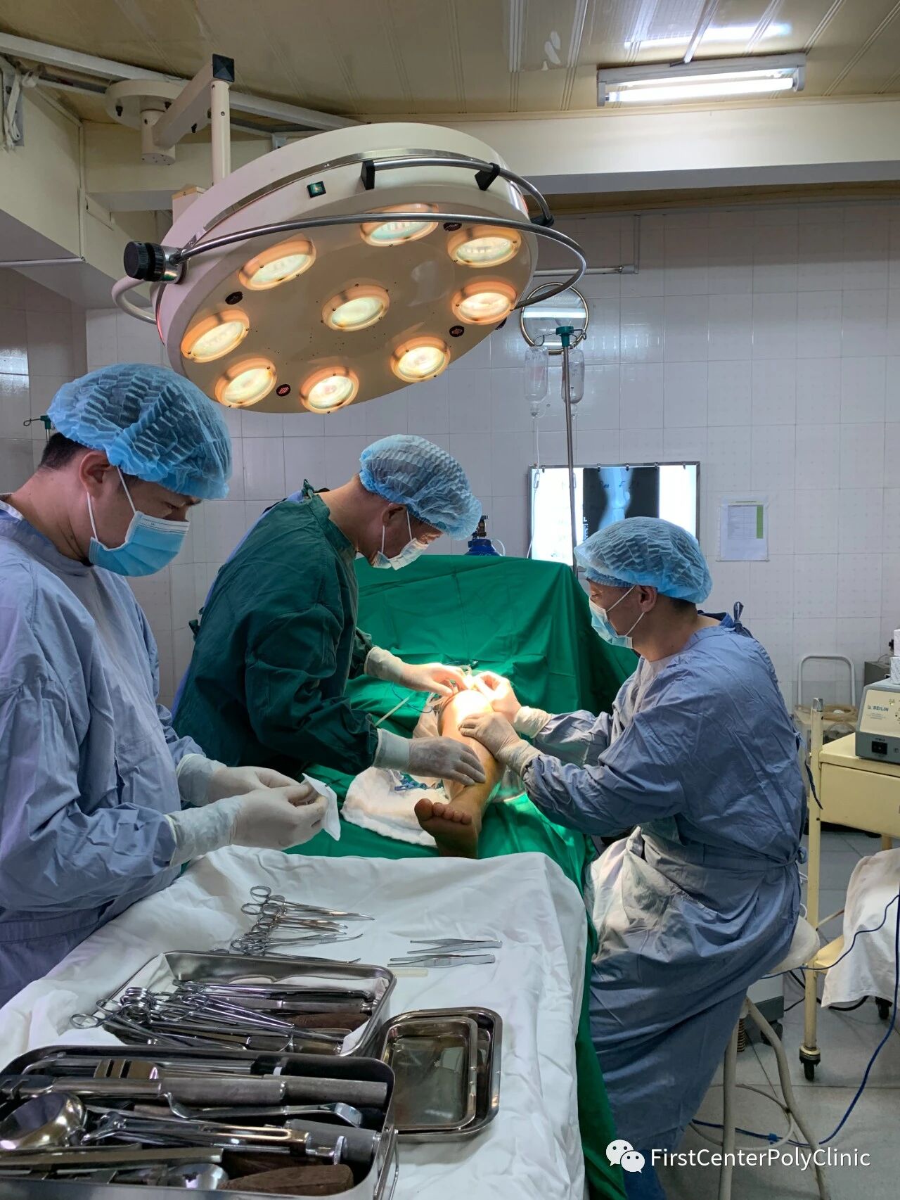 近日,我院接收了一名外伤患者。 患者自述在运动中用力过猛,把膝盖扭了,由于患者由暹粒转院至金边,看着患者腿上重重的石膏,我们发觉此事并不简单,在安抚患者的同时,安排拍片检查,结果发现髌骨明显上移,膝关节肿大,医生会诊后,最终诊断为髌韧带断裂。由于髌韧带起着“承上启下”的作用,如不及时恢复,将来会影响正常的行动。 外科院长当机立断决定手术,在三名主任医师2个多小时的共同努力下,手术顺利完成。通过X光片可以看到,髌骨回归原位,并且在韧带断裂上下方进行了减张固定,以便韧带更好的生长愈合,同时也可以使膝关节尽早恢复功能。 第一综合医院外科蒙院长从医30余年,以技术过硬著称。在北京积水潭医院进修期间,师从中国手外科之父,对手外科和骨外科的手术颇有造诣。近年来在蒙院长的带领下,第一综合医院结合柬埔寨发展形势,在原有基础上大力发展创伤外科,积极开展各类创伤、骨折手术,曾为柬埔寨、韩国、澳大利亚、中国等各国患者完成过外科修复重建,并多次获得称赞。 这里第一综合医院也提醒各位,在剧烈运动前,一定要做好准备热身活动,可以有效得避免扭伤、骨折或韧带撕裂等情况的发生。但意外从不预警,一旦发生,也请您保持镇定及时拨打急救电话或径直尽快就医。 治疗创伤外科哪家强,第一综合医院帮你忙。价格优惠还不贵,消除病痛解忧伤。 详情请拨打电话099 911 911或添加官方微信客服号咨询。 第一综合医院——您的第一选择